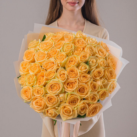 Лента атласная - 1 шт., Современная упаковка - 1 шт., Роза Аваланж пич (50см) РОССИЯ - 15 шт.Доставка 0₽ от 30-ти минут