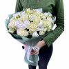 Роза Аваланж (50см) РОССИЯ - 11;Альстромерия - 4;Эустома - 5;Упаковочный материал - 2;Лента атласная - 1;